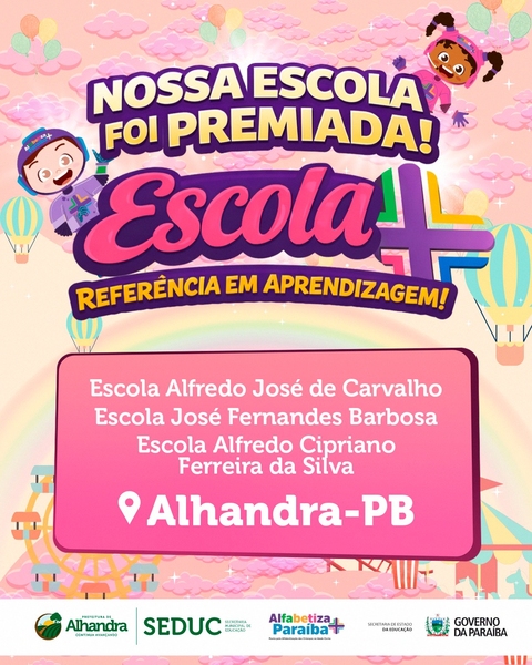 A educação de Alhandra segue avançando e conquistando reconhecimento em nível estadual. O município teve três escolas da rede municipal destacadas no Prêmio Escola Referência em Aprendizagem, iniciativa do Governo da Paraíba que valoriza instituições públicas com bons resultados no processo de alfabetização e no desempenho educacional dos estudantes.