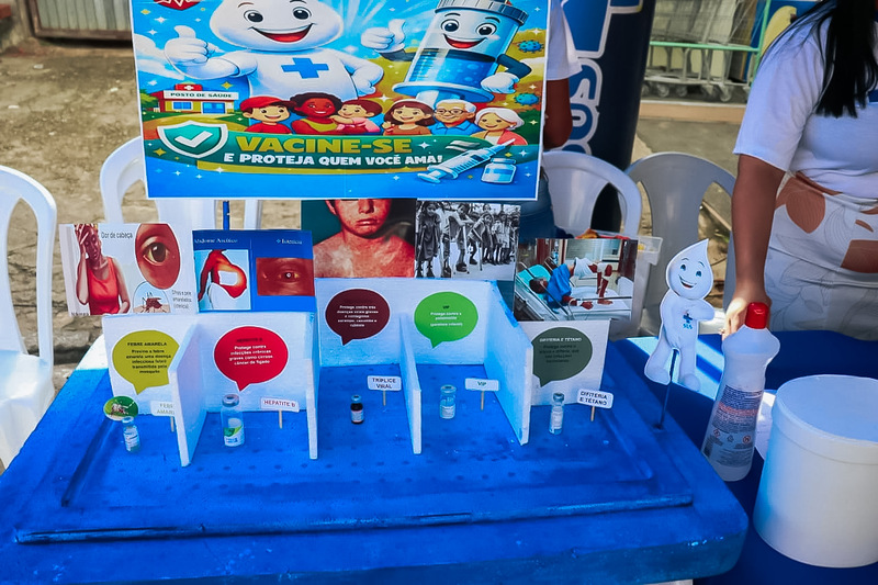 Durante a ação, foram ofertados testes rápidos, aferição de pressão arterial, teste glicêmico, vacinação, orientações em saúde, além de atividades educativas sobre manipulação segura de alimentos, combate ao tabagismo e prevenção às arboviroses e zoonoses.