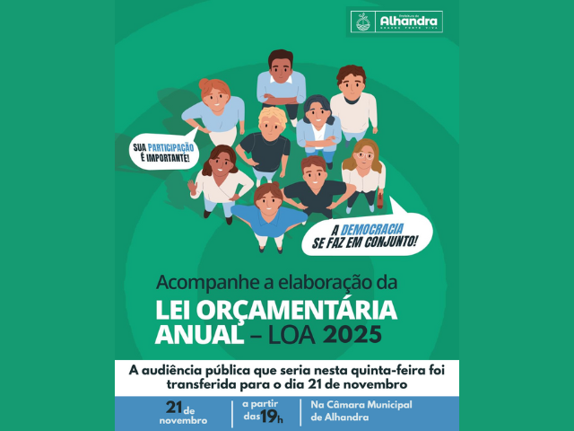 A Prefeitura de Alhandra informa que a audiência pública para a elaboração da Lei Orçamentária Anual (LOA) 2025, inicialmente marcada para esta quinta-feira, foi transferida para o dia 21 de novembro. O encontro será realizado na Câmara Municipal de Alhandra, com início às 19h.