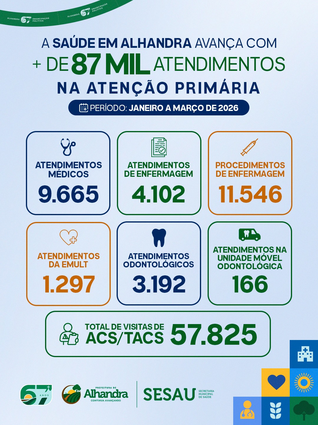 A Prefeitura de Alhandra, por meio da Secretaria Municipal de Saúde, registrou mais de 87 mil atendimentos na Atenção Primária entre os meses de janeiro e março de 2026. Os números refletem o fortalecimento dos serviços básicos de saúde e a ampliação do acesso da população aos atendimentos no município.