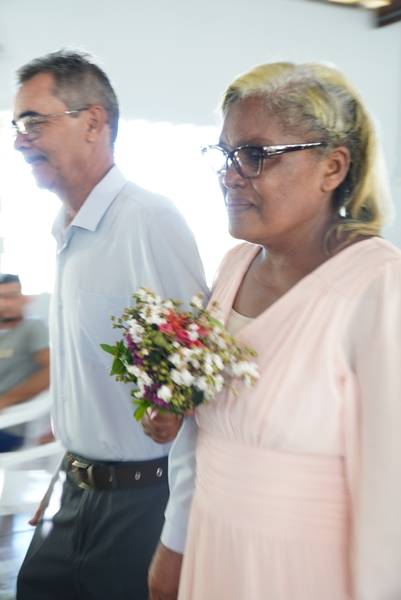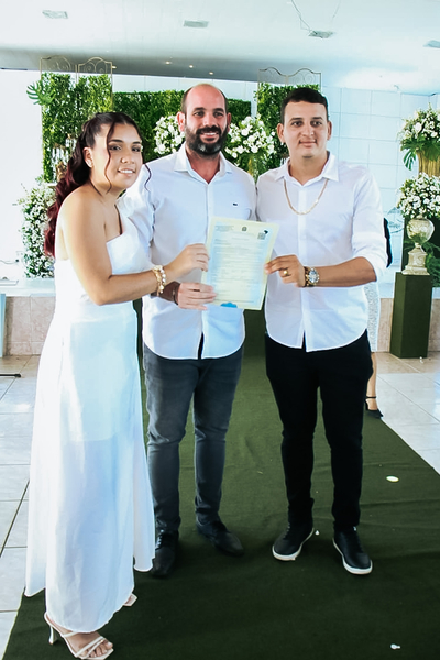 Entre as histórias que marcaram a cerimônia, a de Aldenice e Iran tem uma trajetória construída à distância. O casal se conheceu pela internet, durante um jogo online, e a conexão foi suficiente para transformar a rotina em um novo projeto de vida. Aldenice saiu de Belém do Pará para viver em Alhandra, onde oficializou a união durante a solenidade.